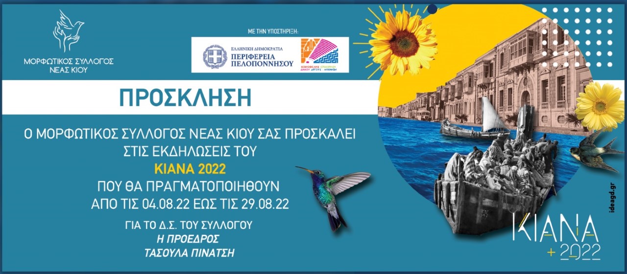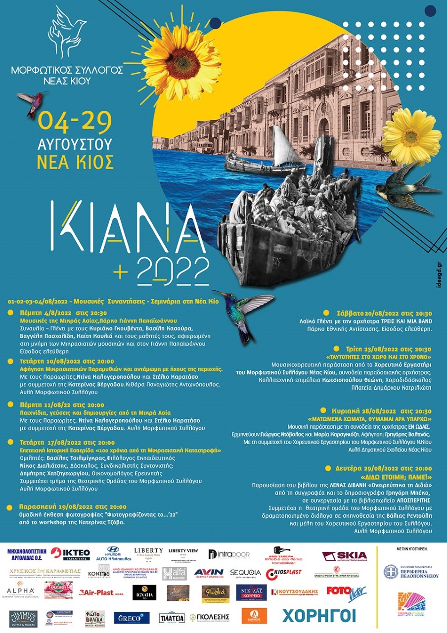 Το φετινό φεστιβάλ ΚΙΑΝΑ 2022 , που διοργανώνει ο Μορφωτικός σύλλογος Ν. Κίου, αποτελεί την κορύφωση των δράσεων όλης της χρονιάς που στην πλειοψηφία τους είναι αφιερωμένες στα 100 χρόνια από τη Μικρασιατική Καταστροφή.