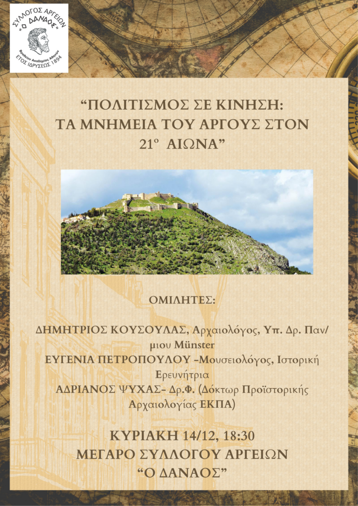 Αγαπητά μέλη και φίλοι του Συλλόγου Αργείων “Ο Δαναός”, με χαρά σας προσκαλούμε στην εκδήλωση με θέμα “Πολιτισμός σε κίνηση: Τα μνημεία Άργους τον 21ο αιώνα”, που θα πραγματοποιηθεί την Κυριακή 14/12/2025 και ώρα 18:30, στο μέγαρο του Συλλόγου, Αγγελή Μπόμπου 8.