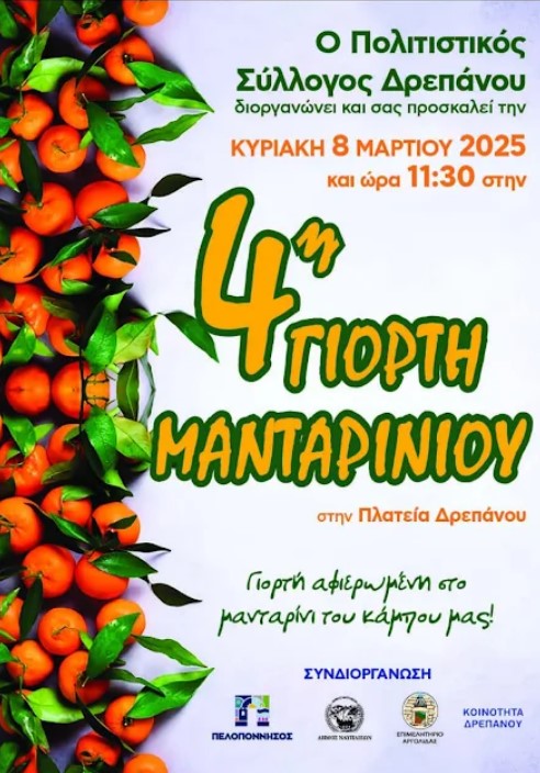 Η τέταρτη Γιορτή Μανταρινιού από τον Πολιτιστικό Σύλλογο Δρεπάνου, είναι γεγονός και θα πραγματοποιηθεί στο Δρέπανο του Δήμου Ναυπλιέων, την Κυριακή 8 Μαρτίου, με ώρα έναρξης στις 11.30 π.μ, στην κεντρική πλατεία του χωριού.
