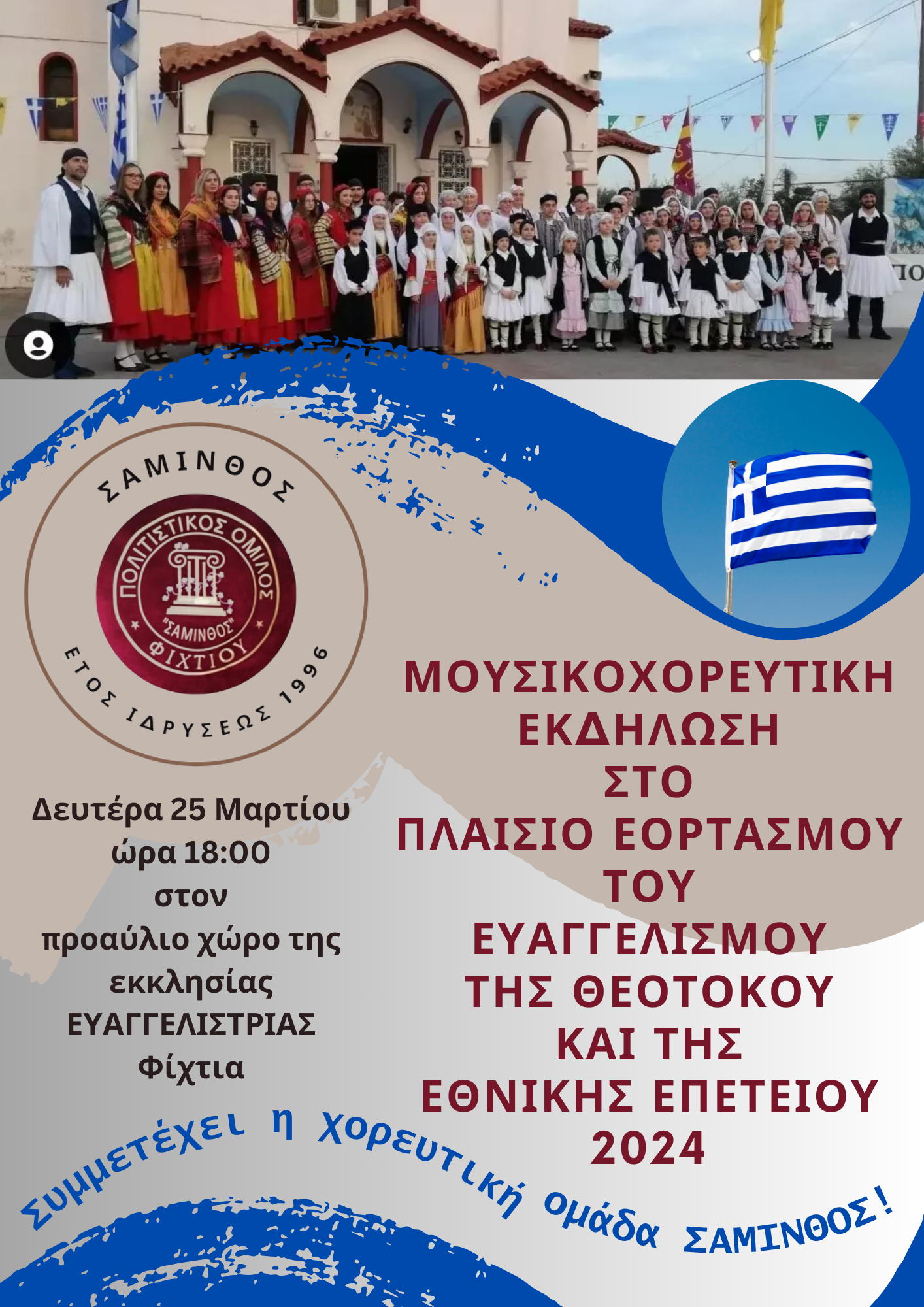Ο πολιτιστικός σύλλογος Φιχτίων Σάμινθος διοργανώνει την Δευτέρα 25 Μαρτίου 2024 μουσικοχορευτική εκδήλωση για τον εορτασμό του Ευαγγελισμού της Θεοτόκου και της εθνικής μας επετείου για την Ελληνική Επανάσταση του 1821!