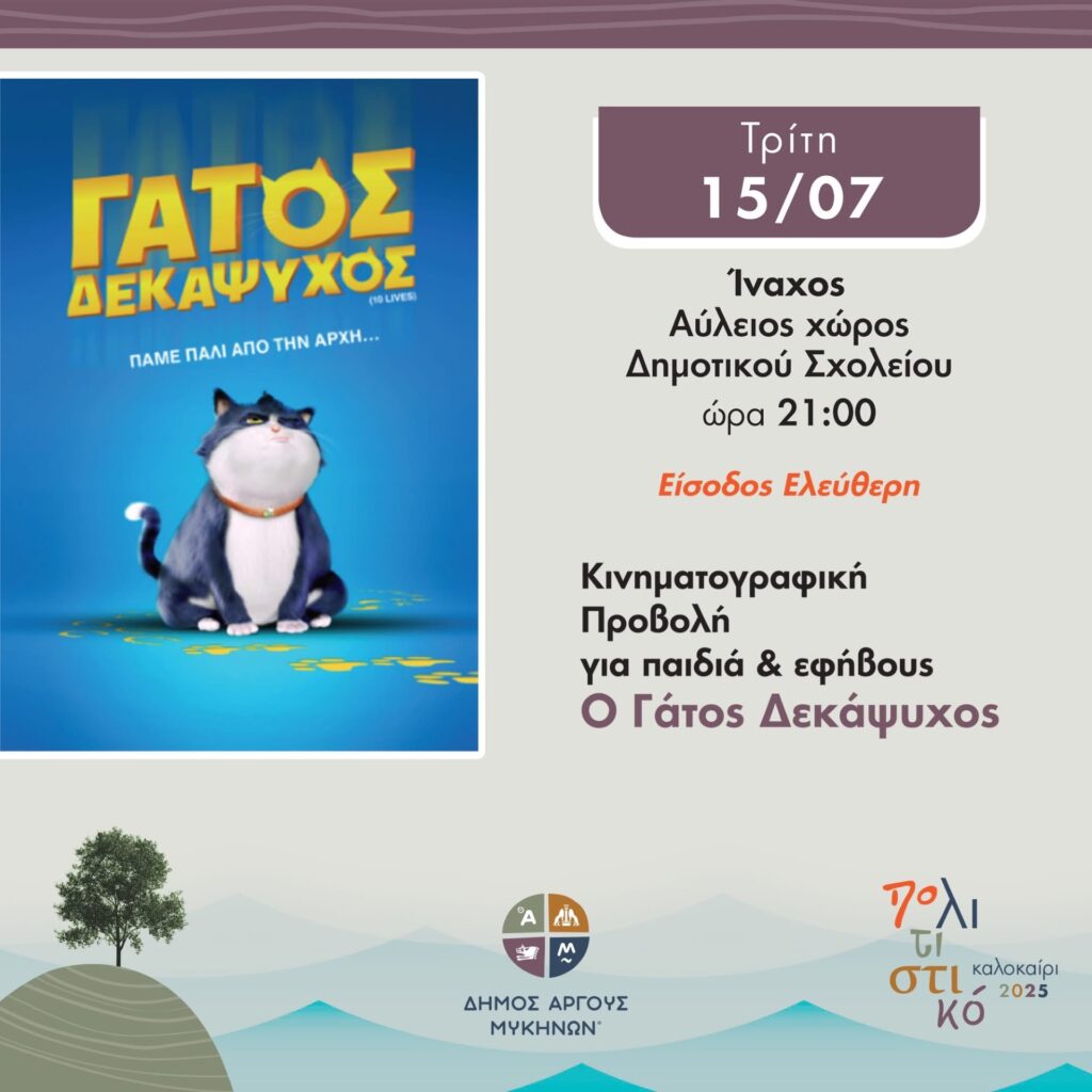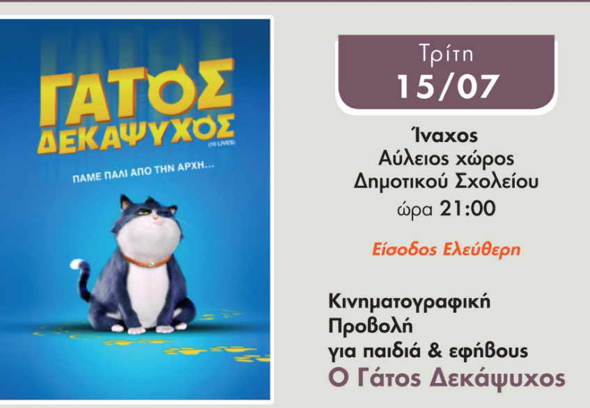 Απόψε Τρίτη 15.07 (21:00) στον Αύλειο χώρο του Δημοτικού Σχολείου Ινάχου, θα πραγματοποιηθεί η κινηματογραφική προβολή της ταινίας “Γάτος δεκάψυχος”.