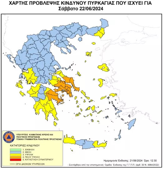 Πολύ υψηλός κίνδυνος πυρκαγιάς (κατηγορία κινδύνου 4) προβλέπεται το Σάββατο (22/6) για τις Περιφέρειες Αττικής, Στερεάς Ελλάδας (ΠΕ Εύβοιας, ΠΕ Βοιωτίας) και Πελοποννήσου (ΠΕ Κορινθίας, ΠΕ Αργολίδας), όπως προκύπτει από τον χάρτη πρόβλεψης κινδύνου που εκδίδει η Γενική Γραμματεία Πολιτικής Προστασίας του υπουργείου Κλιματικής Κρίσης & Πολιτικής Προστασίας.