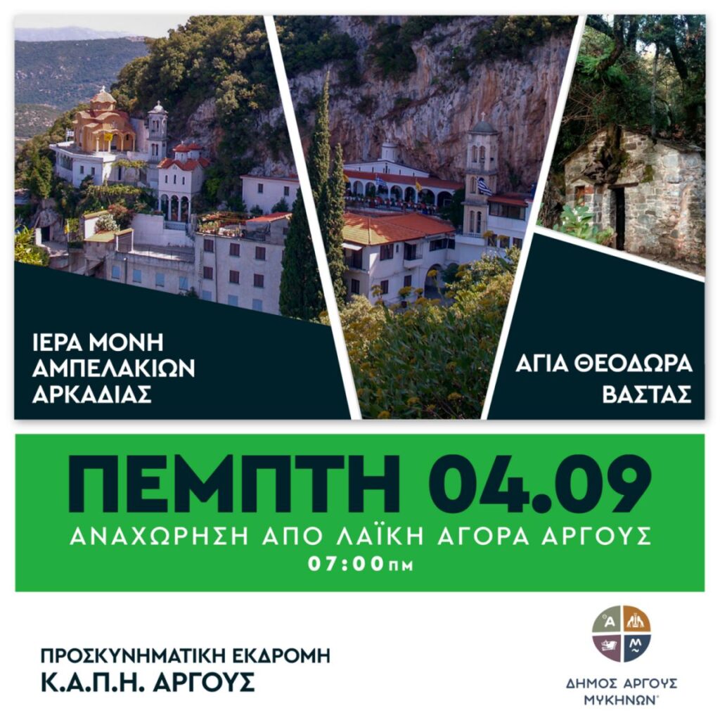 Το ΚΑΠΗ του Δήμου Άργους-Μυκηνών ανακοινώνει τη διοργάνωση μονοήμερης προσκυνηματικής εκδρομής στη Μονή Αμπελάκια Αρκαδίας, την Πέμπτη 4 Σεπτεμβρίου.