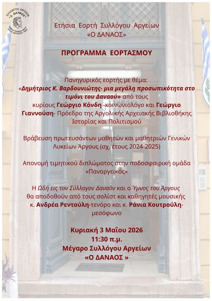 Ο Σύλλογος Αργείων «Ο Δαναός» σας προσκαλεί στην ετήσια εορτή του η οποία θα πραγματοποιηθεί την Κυριακή 3 Μαΐου 2026, κατά την οποία τιμάται η μνήμη του Αγίου Πέτρου, Επισκόπου και Πολιούχου του Άργους, Θαυματουργού και Προστάτου του Συλλόγου, και ώρα 11:30 π.μ. στην αίθουσα διαλέξεων του Συλλόγου Αργείων «Ο Δαναός».
