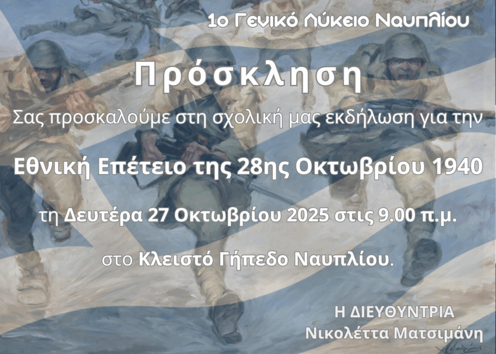 Σας προσκαλούμε στη σχολική μας εκδήλωση για την Εθνική Επέτειο της 28ης Οκτωβρίου 1940 τη Δευτέρα, 27 Οκτωβρίου 2025 στις 9.00 π.μ. στο Κλειστό Γήπεδο Ναυπλίου.