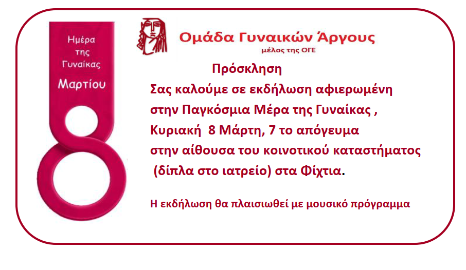 H Ομάδα Γυναικών Άργους ( μέλος της ΟΓΕ) τιμά την 8η Μάρτη και απευθύνεται σε όλες τις γυναίκες του μόχθου , τις εργαζόμενες , τις αυτοαπασχολούμενες , τις αγρότισσες, τις φοιτήτριες , τις νέες μητέρες, τις μετανάστριες πρόσφυγες.