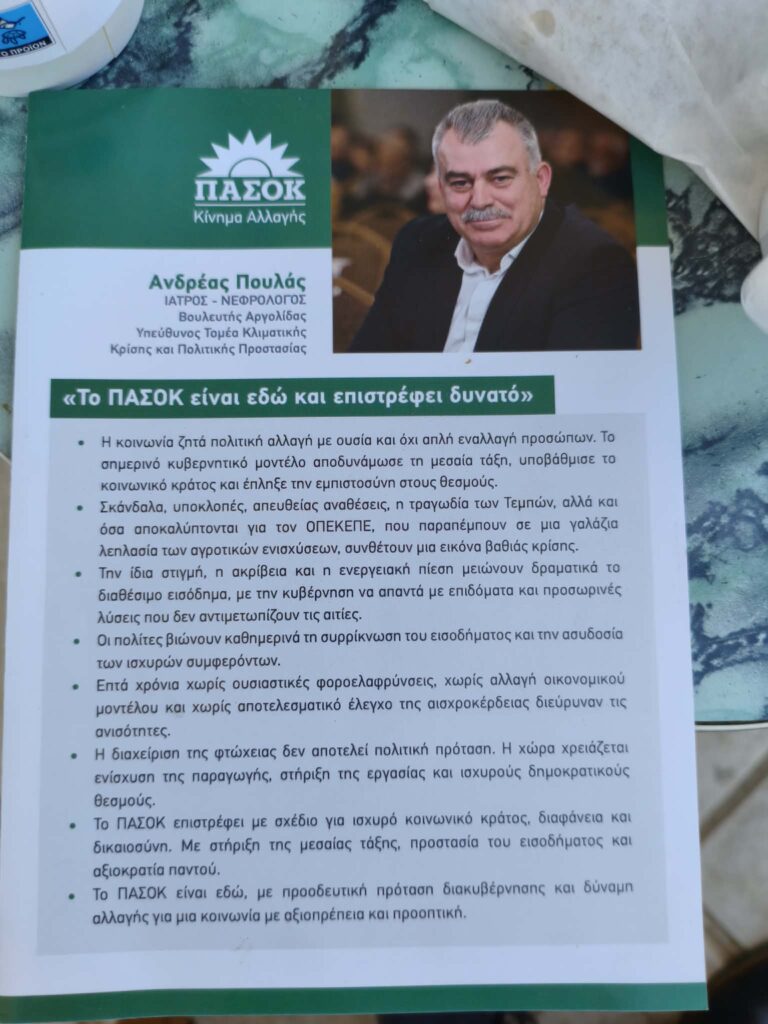 “Την έναρξη” της προεκλογικής περιόδου κήρυξε ο Βουλευτής Αργολίδας, Ανδρέας Πουλάς που εμφανίσθηκε στην λαϊκή αγορά Ναυπλίου το πρωί της Μεγάλης Παρασκευής, να μοιράζει φυλλάδια με ευχές για την Ανάσταση αλλά και τις πολιτικές θέσεις του ΠΑΣΟΚ ξαφνιάζοντας όσους τον έβλεπαν και δημιουργώντας έτσι μια σειρά ερωτηματικών.