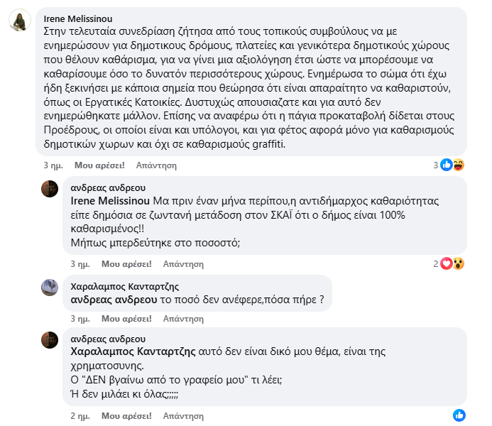 Τα ερωτήματα είναι πολλά. Πού πήγαν τα χρήματα; Σε ποιο συνεργείο αναφέρεται η κα Μελισσηνού; Σε ιδιωτική εταιρία; Σε κάποια απευθείας ανάθεση που δεν γνωρίζουμε; Και τι κάνει η Υπηρεσία καθαριότητας του Δήμου; Δεν υπάρχουν υπάλληλοι που εργάζονται στην καθαριότητα και πληρώνονται από το Δήμο;