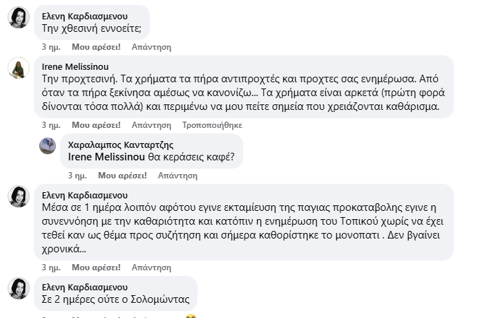 Σύμφωνα με την Ειρήνη Μελισσηνού, τα χρήματα που δόθηκαν είναι πολύ περισσότερα σε σχέση με άλλες φορές και αφού τα εισέπραξε, άρχισε άμεσα τις ενέργειες για καθαρισμούς και κατόπιν ενημέρωσε το Τοπικό Συμβούλιο, όπως παραδέχεται η ίδια. Μάλιστα, ευχαρίστησε και τους εργαζόμενους του συνεργείου για τη δουλειά τους.