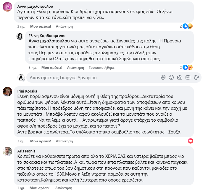 Στη συζήτηση παρενέβη και η Ρένα Κόρακα, Δημοτική Σύμβουλος στο Τοπικό που ανέφερε: «Ελενη Καρδιασμενου είναι μόνιμη αυτή η θέση της προέδρου…Δικτατορία του αριθμού των ψήφων λέγεται αυτό…έτσι η δημοκρατία των αποφάσεων από κοινού πάει περίπατο. Η πρόεδρος μόνη της αποφασίζει και μόνη της κάνει και την αρχή με το μονοπάτι. Μπράβο λοιπόν αφού ακολουθεί και το μονοπάτι που άνοιξε ο παππούς…Να τα λέμε κι αυτά.. …Αναρωτιέμαι γιατί άραγε υπάρχει το συμβούλιο αφού ο/η πρόεδρος έχει το μαχαίρι και το πεπόνι ? Άντε βρε και εις ανώτερα… Το υπόλοιπο τοπικό συμβούλιο της κοινότητας …Σουζα».