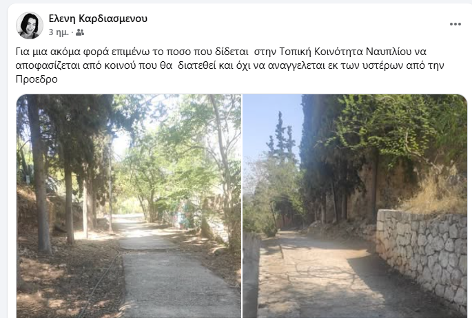 «Για μια ακόμα φορά επιμένω το ποσό που δίδεται στην Τοπική Κοινότητα Ναυπλίου να αποφασίζεται από κοινού πού θα διατεθεί και όχι να αναγγέλλεται εκ των υστέρων από την Πρόεδρο», αναφέρει η κα Καρδιασμένου.