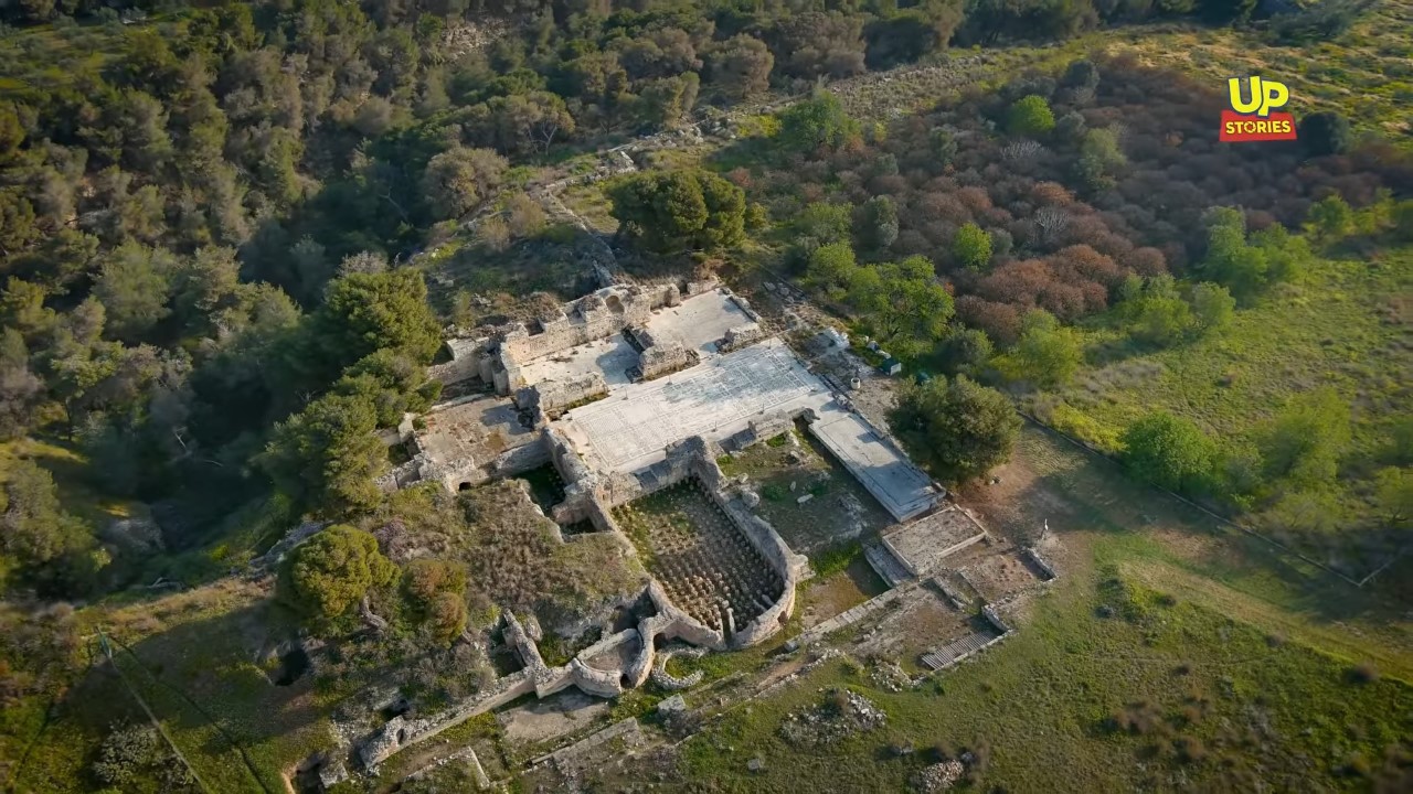Βόρεια και βορειοδυτικά αυτού το έδαφος κατέρχεται απότομα και αποτελεί την πλευρά της μεγάλης χαράδρας βάθους 40,0μ. Το συγκρότημα ανασκάφτηκε πλήρως στα μέσα της δεκαετίας του 1970 από την Αμερικανική Σχολή Κλασικών Σπουδών (Α.Σ.Κ.Σ.), με μία ομάδα από το Πανεπιστήμιο της Καλιφόρνιας στο Λος Άντζελες (UCLA), υπό τη διεύθυνση του Paul Clement. Νωρίτερα, το 1954 ο Oscar Broneer, την Αμερικανικής Σχολής Κλασικών Σπουδών (Α.Σ.Κ.Σ.), για λογαριασμό του πανεπιστημίου του Chicago, είχε αποκαλύψει τμήματα των δωματίων XI και XIII τα οποία έφεραν υπόκαυστα. Επιλεγμένες ανασκαφές και συντήρηση του μοναδικού μωσαϊκού της αίθουσας VI συνεχίστηκαν τη δεκαετία του 1980 από την Αμερικανική Σχολή Κλασικών Σπουδών (Α.Σ.Κ.Σ.) με τον Timothy Gregory του Ohio State University.