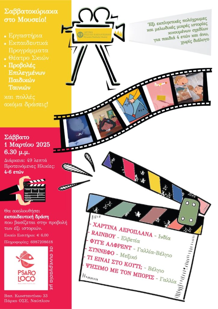 Σε συνεργασία με το Psaroloco Παιδικό και Εφηβικό Διεθνές Φεστιβάλ Κινηματογράφου, το Μουσείο ξεκινά μία σειρά προβολών ταινιών κινουμένων σχεδίων και παιδικών και εφηβικών ταινιών, παραγωγές από όλο τον κόσμο, με ιδιαίτερη κοινωνική και αισθητική ματιά, που μεταφέρουν στα παιδιά τρυφερά μηνύματα που καλλιεργούν τον χαρακτήρα τους και εμπλουτίζουν τον εσωτερικό τους κόσμο. Οι προβολές απευθύνονται σε διαφορετικές ηλικιακές ομάδες.