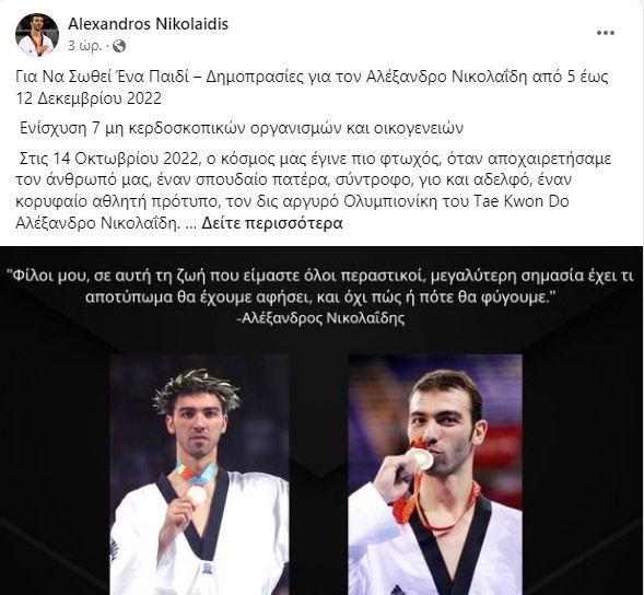 Στις 14 Οκτωβρίου 2022, ο κόσμος μας έγινε πιο φτωχός, όταν αποχαιρετήσαμε τον άνθρωπό μας, έναν σπουδαίο πατέρα, σύντροφο, γιο και αδελφό, έναν κορυφαίο αθλητή πρότυπο, τον δις αργυρό Ολυμπιονίκη του Τae Κwon Do Αλέξανδρο Νικολαΐδη.