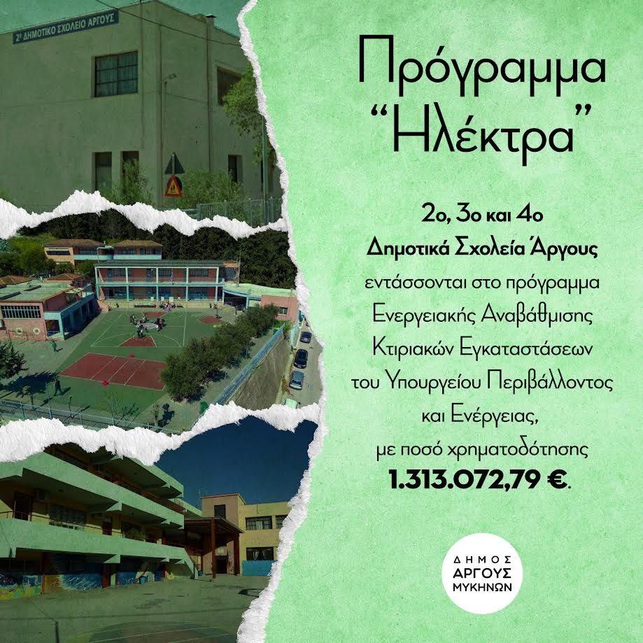 Ο Δήμος Άργους-Μυκηνών είναι στην ευχάριστη θέση να ανακοινώσει την ένταξη τριών σχολικών μονάδων στο πρόγραμμα ‘’Ηλέκτρα’’ με τίτλο: “Ενεργειακή Αναβάθμιση Κτιριακών Εγκαταστάσεων” του Υπουργείου Περιβάλλοντος και Ενέργειας, με ποσό χρηματοδότησης 1.313.072€.