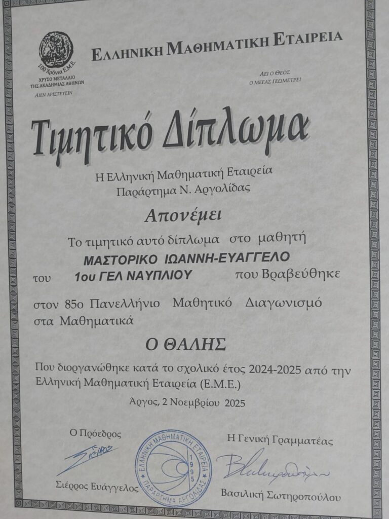 Συγχαρητήρια στους Διακριθέντες Μαθητές του 1ου ΓΕΛ ΝΑΥΠΛΙΟΥ που συμμετείχαν στους Διαγωνισμούς Μαθηματικών «Θαλής» και «Ευκλείδης»