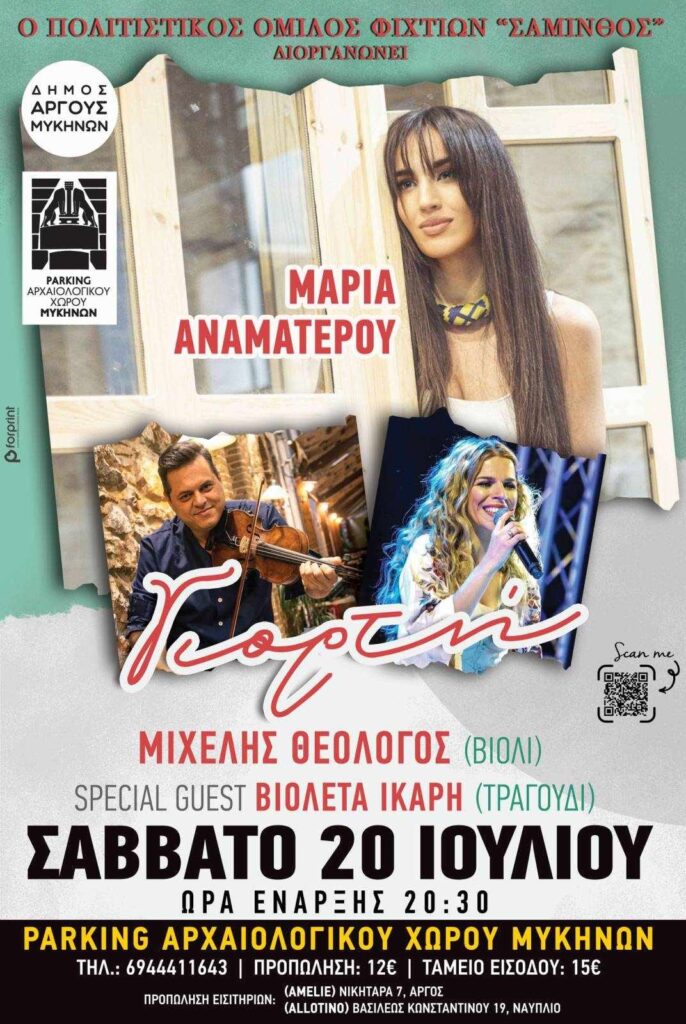 Ο πολιτιστικός σύλλογος ΣΑΜΙΝΘΟΣ διοργανώνει το Σάββατο 20/07/2024 στο parking του αρχαιολογικού χώρου Μυκηνών συναυλία με τους ΜΑΡΙΑ ΑΝΑΜΑΤΕΡΟΥ(τραγούδι) – ΜΙΧΕΛΗΣ ΘΕΟΛΟΓΟΣ(βιολί) και Special Guest την ΒΙΟΛΕΤΑ ΙΚΑΡΗ(τραγούδι).