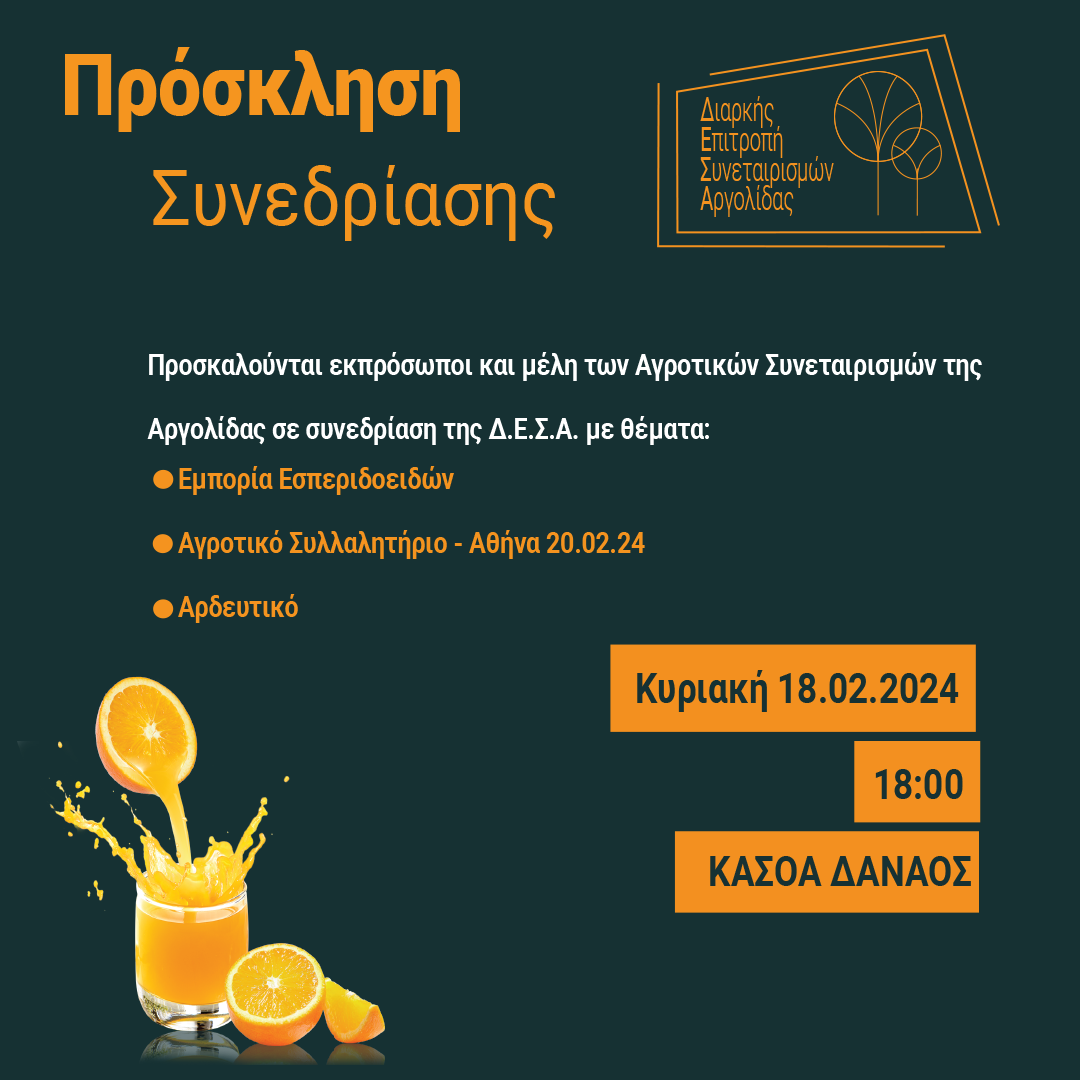 Πρόσκληση προς τις διοικήσεις και τα μέλη των αγροτικών συνεταιρισμών της Αργολίδας σε συνεδρίαση απευθύνει η Διαρκής Επιτροπή Συνεταιρισμών Αργολίδας. Η συνεδρίαση θα πραγματοποιηθεί την Κυριακή 18 Φεβρουαρίου 2024 και ώρα 18:00, στην ΚΑΣΟΑ ΔΑΝΑΟΣ με θέματα: