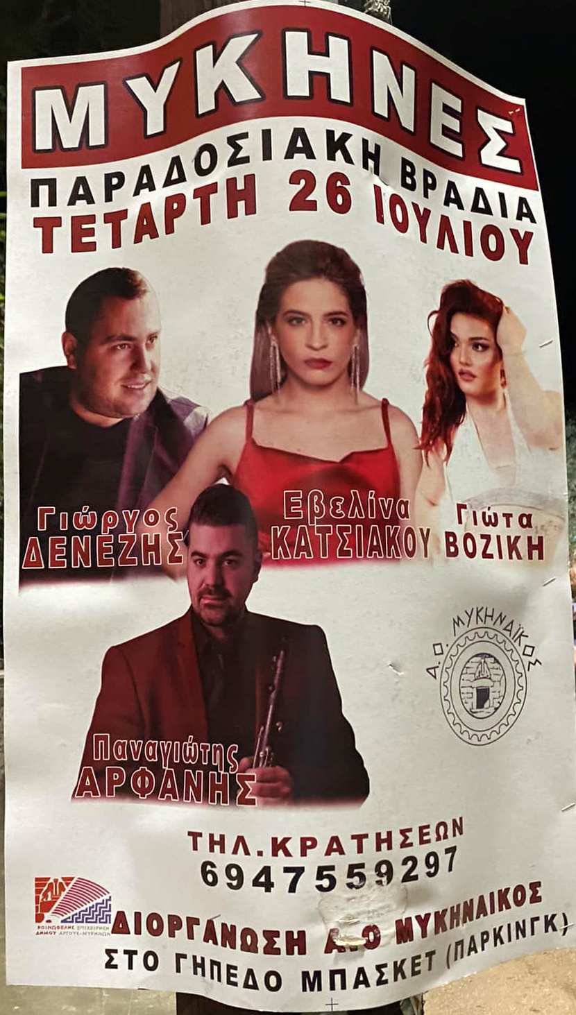 -Παραδοσιακή Βραδιά στο γήπεδο μπάσκετ (πάρκινκ) στις Μυκήνες διοργανώνει στις 26 Ιουλίου ο Α.Ο. Μυκηναϊκός και η ΚΕΔΑΜ.