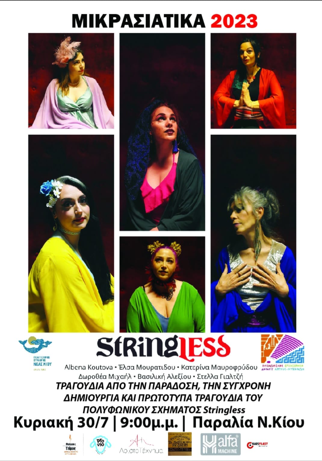 -Την Κυριακή 30 Ιουλίου και ώρα 9μμ στην παραλία της Ν. Κίου θα ακούσουμε το πολυφωνικό συγκρότημα Stringless ! Έξι γυναικείες φωνές θα ερμηνεύσουν τραγούδια από την παράδοση, τη σύγχρονη δημιουργία και δικά τους πρωτότυπα τραγούδια. Οι Stringless είναι: Αμλμπενα Κουτοβα, Έλσα Μουρατίδου, Κατερίνα Μαυροφρύδου, Δωροθέα Μιχαήλ, Βασιλική Αλεξίου, Στέλλα Γιαλτζή. Η εκδήλωση εντάσσεται στα «Μικρασιάτικα 2023» που οργανώνει ο Πολιτιστικός σύλλογος Ν. Κίου με την υποστήριξη της ΚΕΔΑΜ.