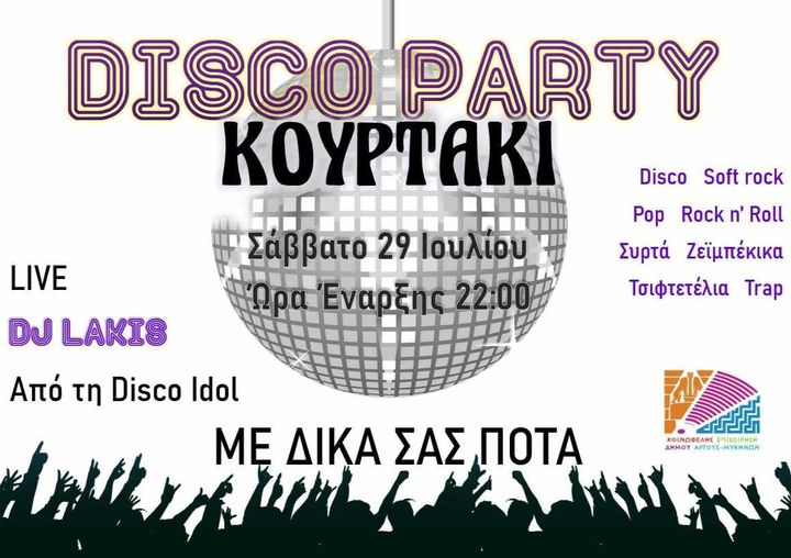 -Disco Party στο Κουρτάκι διοργανώνει η ΚΕΔΑΜ και η Τοπική Κοινότητα Κουρτακίου στις 29 Ιουλίου και ώρα 10μμ. Live DJ o Lakis από τη Disco Idol.