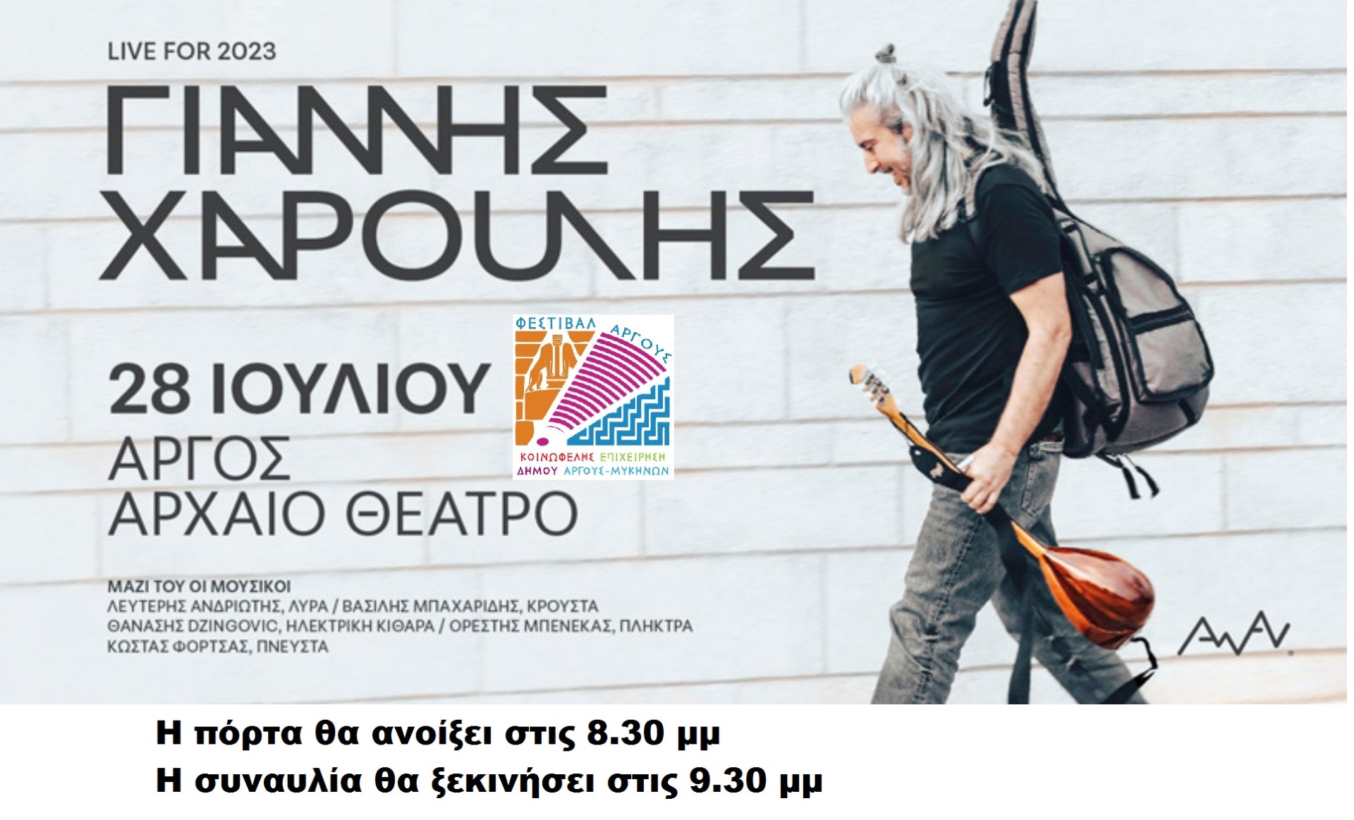 -Την Παρασκευή 28 Ιουλίου στο Αρχαίο Θέατρο Άργους, στο πλαίσιο του Φεστιβάλ Άργους 2023 που οργανώνει η ΚΕΔΑΜ, ο Γιάννης Χαρούλης και η παρέα του θα τραγουδήσουν για μας.