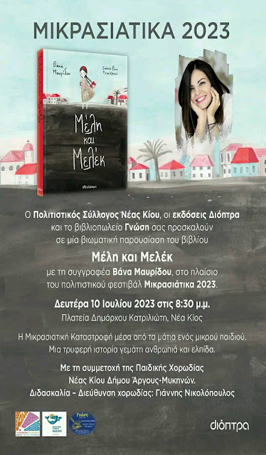 «Βιωματική παρουσίαση του βιβλίου “Μέλη και Μελέκ”» με τη συγγραφέα Βάνα Μαυρίδου, από τις εκδόσεις Διόπτρα & το βιβλιοπωλείο Γνώση. Η Μικρασιατική Καταστροφή μέσα από τα μάτια ενός μικρού παιδιού. Μια τρυφερή ιστορία γεμάτη ανθρωπιά και ελπίδα.