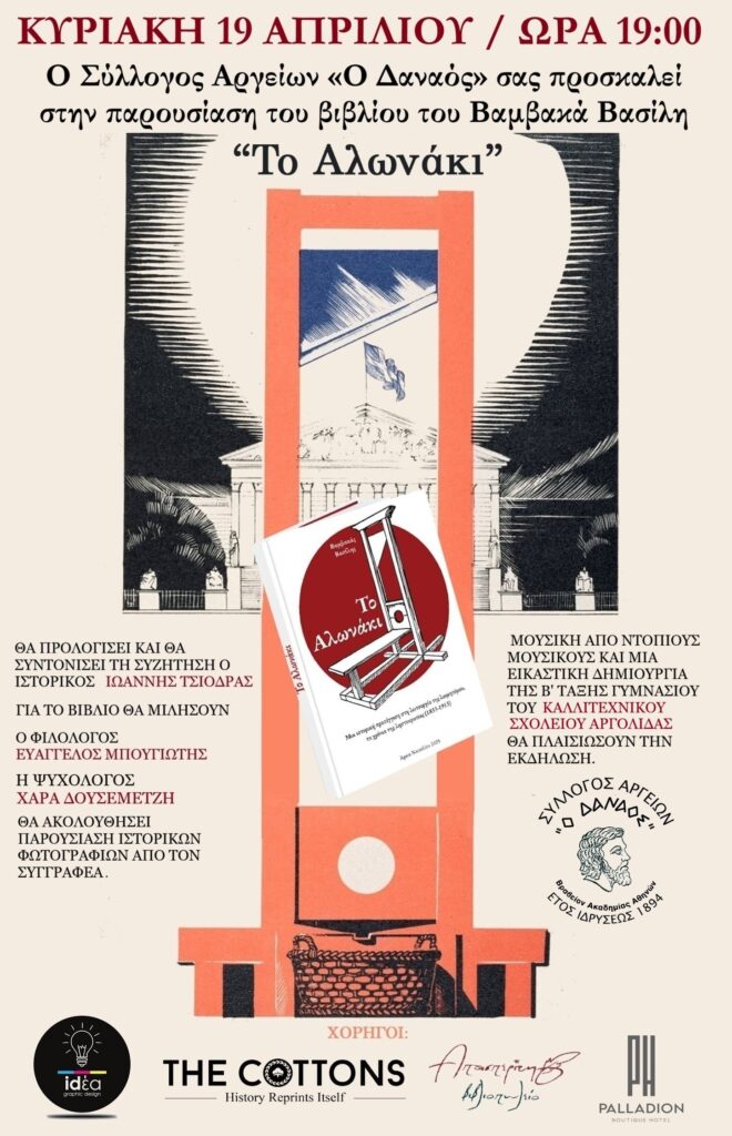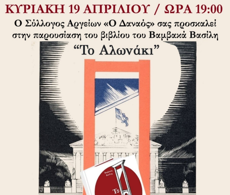 Ο Σύλλογος Αργείων ο Δαναός σας προσκαλεί στην παρουσίαση βιβλίου του κυρίου Βασίλη Βαμβακά με τίτλο Το αλωνάκι, που θα πραγματοποιηθεί την Κυριακή 19 Απριλίου 2026 στο Μέγαρο του Συλλόγου Αργείων «Ο Δαναός», στο Άργος (Αγγελή Μπόμπου 8).