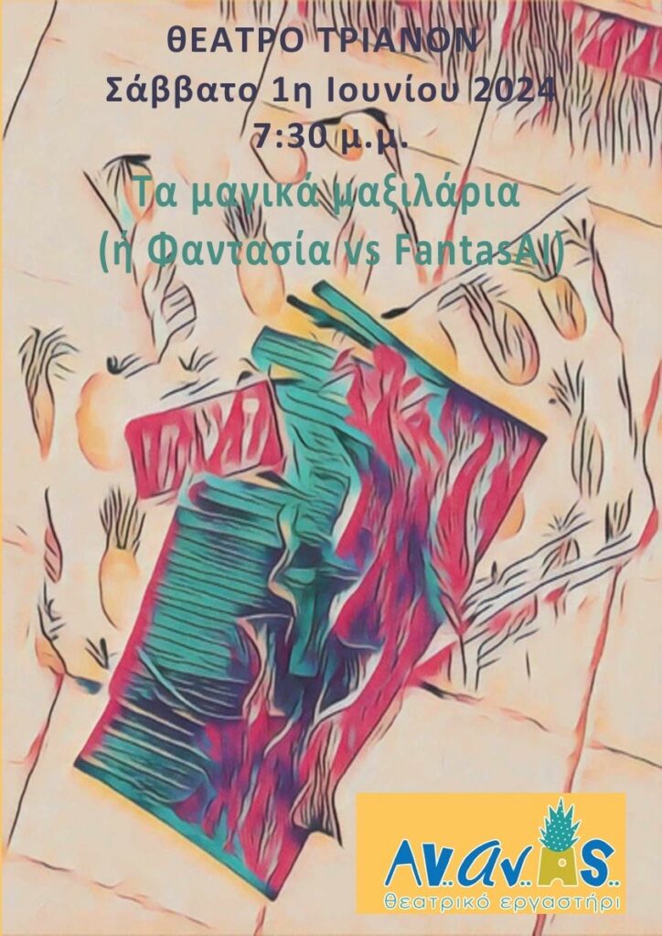 Το Σάββατο 1η Ιουνίου δύο από τμήματα του θεατρικού εργαστηρίου «Αν…Αν…Ας» ολοκλήρωσαν τον κύκλο της θεατρικής χρονιάς με την παράσταση «Τα μαγικά μαξιλάρια ή Φαντασία vs FantasAI» σε διασκευή και σκηνοθεσία της επιστημονικής υπεύθυνης του εργαστηρίου Αγγελικής Τσάκωνα. Το θέμα που διαπραγματεύτηκαν τα παιδιά ήταν η ελευθερία του ανθρώπου μέσα σε έναν κόσμο που κατακλύζει η τεχνολογία και αναζήτησαν με όχημα το όνειρο και τη φαντασία το δώρο της πραγματικής ζωής. Η εκδήλωση είχε φιλανθρωπικό χαρακτήρα με αποδέκτη της ενίσχυσης τον Σύλλογο ΑΜΕΑ Αργολίδας.
