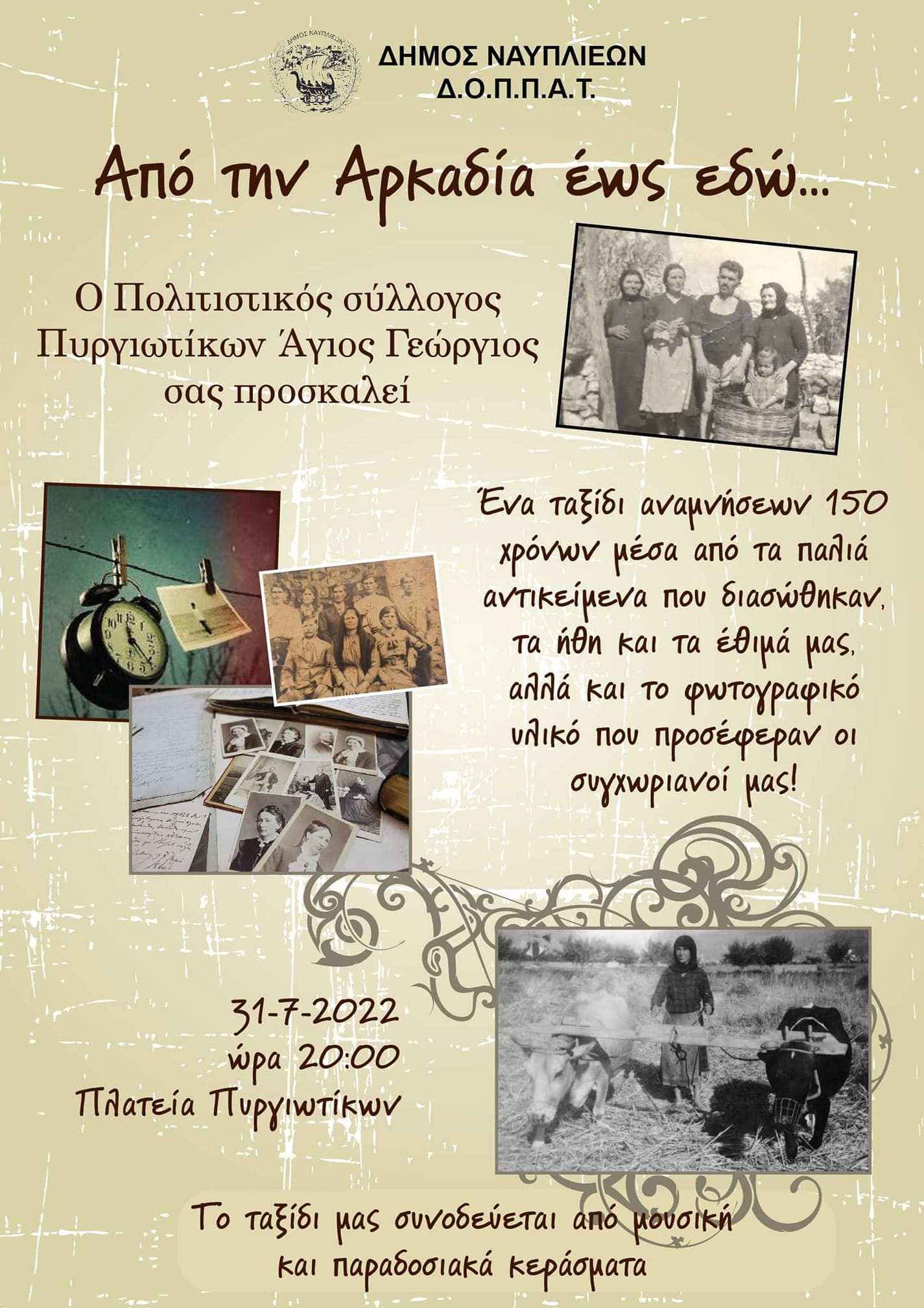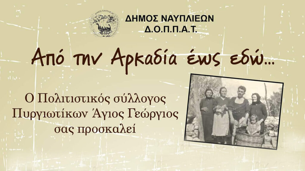 Ο Πολιτιστικός Σύλλογος Πυργιωτίκων «Άγιος Γεώργιος», σε συνεργασία με τον Δήμο Ναυπλιέων και τον ΔΟΠΠΑΤ διοργανώνουν εκδήλωση με τίτλο: «Από την Αρκαδία ως εδώ…»