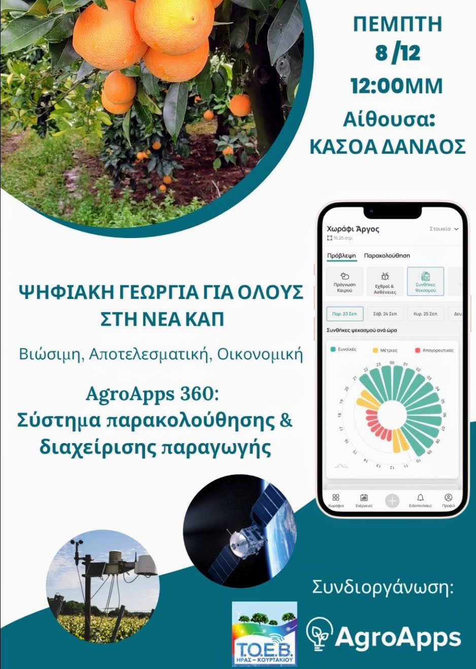 Την Πέμπτη 8/12/2022, στις 12 μμ, στην αίθουσα της ΚΑΣΟΑ ΔΑΝΑΟΣ, ο ΤΟΕΒ Ήρας – Κουρτακίου και η AgroApps διοργανώνουν εκδήλωση με θέμα «Ψηφιακή Γεωργία για όλους στη Νέα ΚΑΠ». Κατά τη διάρκεια της εκδήλωσης θα γίνει παρουσίαση του ψηφιακού συστήματος AgroApps 360ο και των πλεονεκτημάτων που παρέχει στον παραγωγό. Το AgroApps 360ο είναι ένα σύστημα απομακρυσμένης παρακολούθησης και στοχευμένης διαχείρισης καλλιεργειών. Από την έναρξη μέχρι το τέλος της καλλιεργητικής περιόδου προσφέρει εξατομικευμένες προτάσεις, συμβουλές και προειδοποιήσεις σχετικά με την ανάπτυξη της καλλιέργειας, την άρδευση, τη λίπανση, καθώς και τη φυτοπροστασία. Επιπλέον, προσφέρει υψηλής ανάλυσης πρόγνωση καιρού και προειδοποιήσεις για ακραία καιρικά φαινόμενα.
