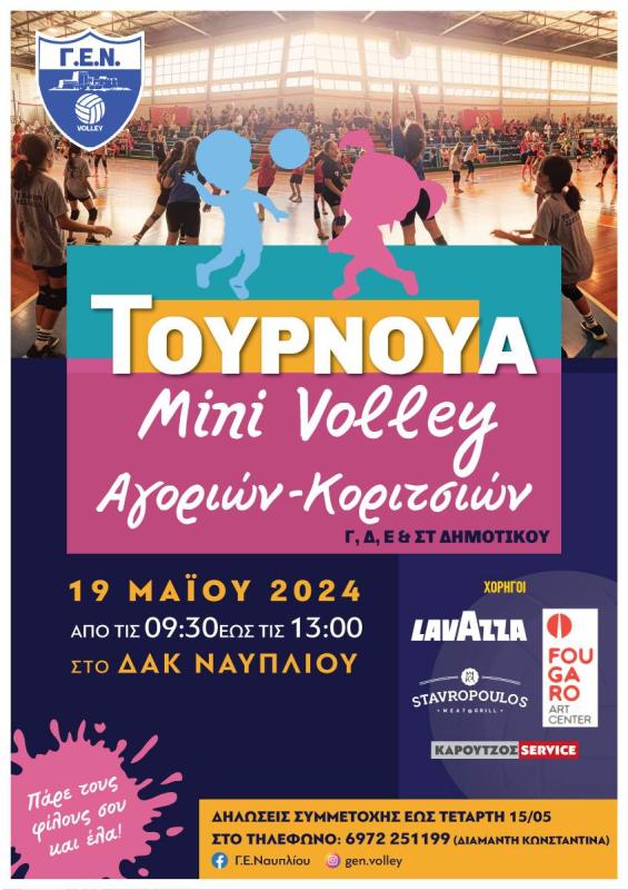 Το ετήσιο σχολικό Τουρνουά βόλεϊ για αγόρια και κορίτσια από Γ’ – ΣΤ’ Δημοτικού θα πραγματοποιηθεί την Κυριακή 19 Μαΐου στο Κλειστό Γυμναστήριο Ναυπλίου. Η συμμετοχή είναι ελεύθερη. Θα υπάρχει μουσική αλλά και ΔΩΡΕΑΝ ΛΑΧΝΟΙ για όλους τους συμμετέχοντες.
