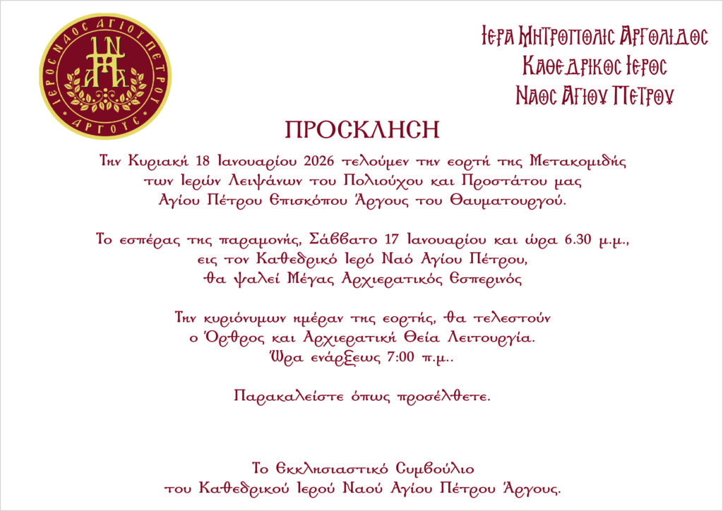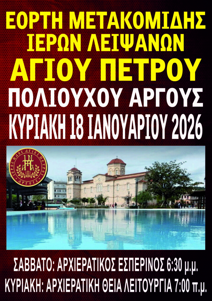 Γίνεται γνωστό εις τους ευσεβείς Χριστιανούς ότι η Εορτή της Μετακομιδής των Ιερών Λειψάνων του εν Αγίοις Πατρός ημών Πέτρου Επισκόπου Άργους του Θαυματουργού θα εορτασθεί φέτος την ΚΥΡΙΑΚΗ 18η ΙΑΝΟΥΑΡΙΟΥ ως εξής: