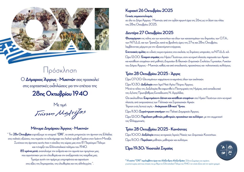 Ο Δήμαρχος Άργους – Μυκηνών σας προσκαλεί στις εορταστικές εκδηλώσεις για την επέτειο της 28ης Οκτωβρίου 1940