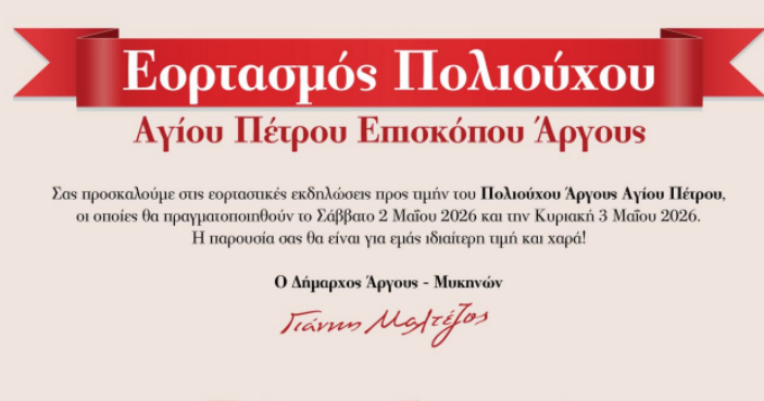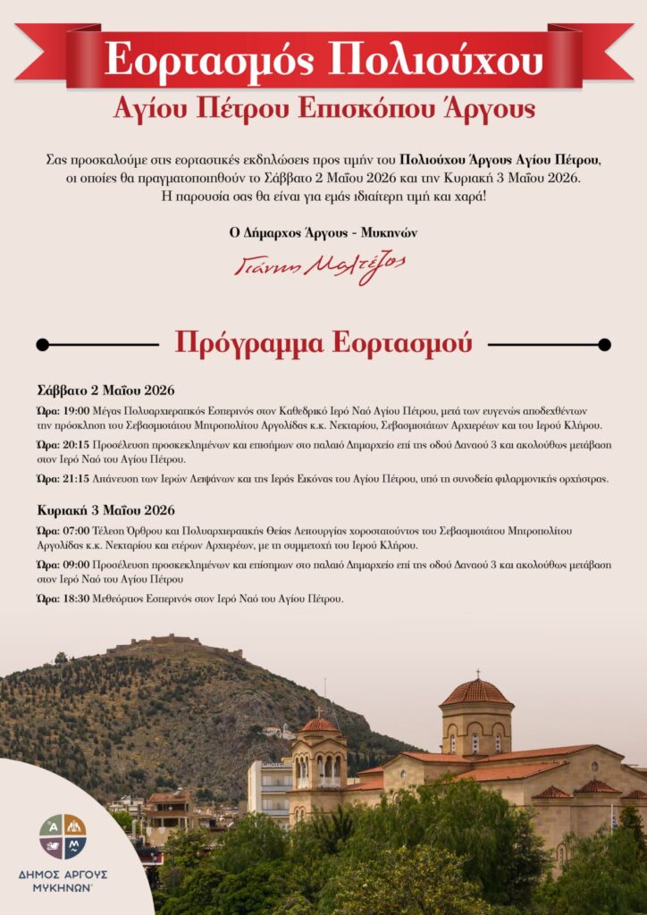 Ο Δήμαρχος Άργους – Μυκηνών Γιάννης Μαλτέζος σας προσκαλεί στις εορταστικές εκδηλώσεις προς τιμήν του Πολιούχου Άργους Αγίου Πέτρου , οι οποίες θα πραγματοποιηθούν το Σάββατο 2 Μαΐου 2026 και την Κυριακή 3 Μαΐου 2026.
