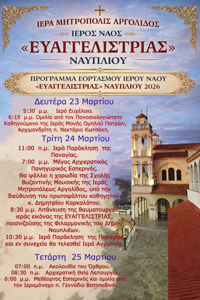 Το πρόγραμμα εορτασμού του Ι. Ν. Ευαγγελιστρίας Ναυπλίου