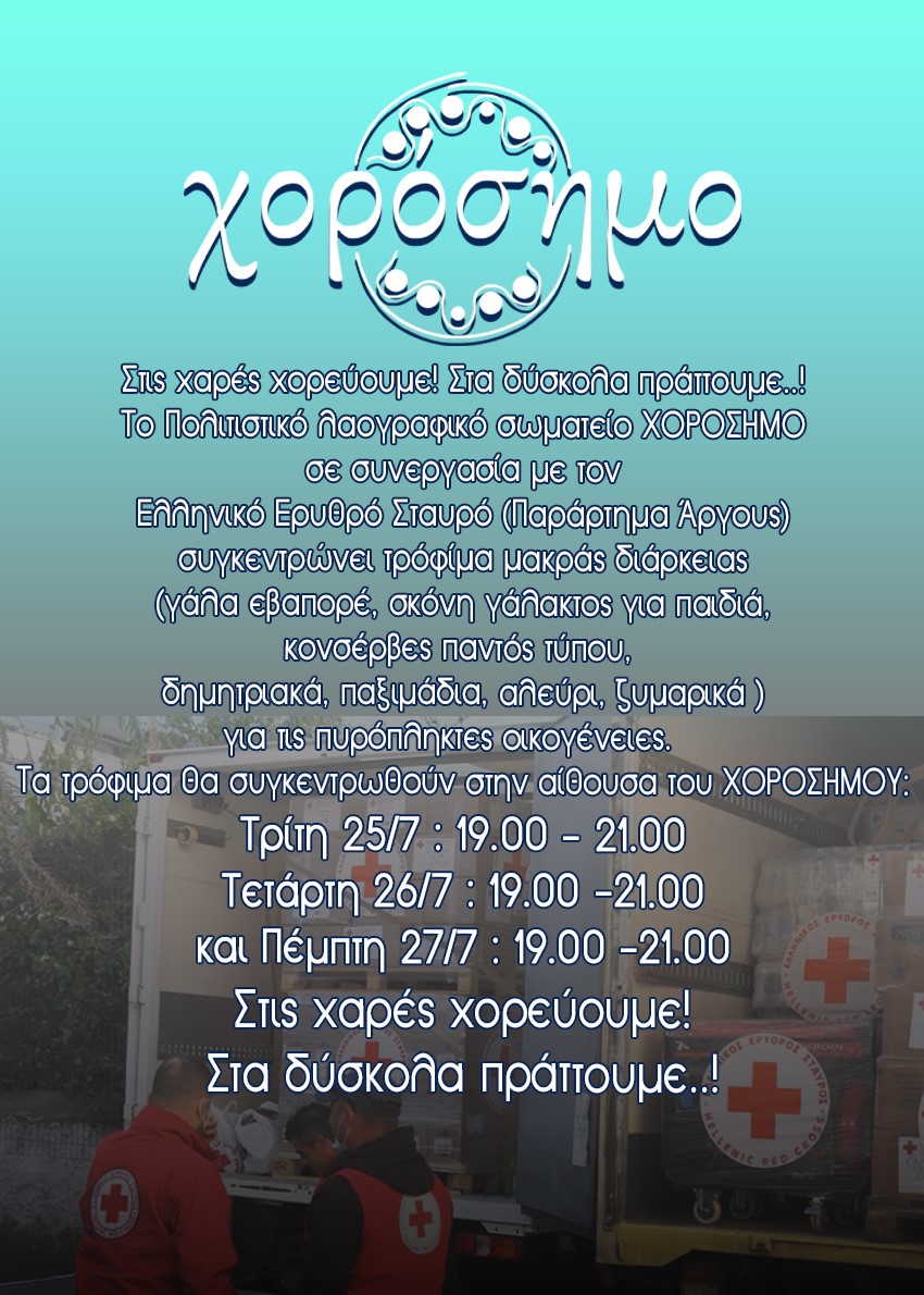 Το Πολιτιστικό λαογραφικό σωματείο ΧΟΡΟΣΗΜΟ σε συνεργασία με τον Ελληνικό Ερυθρό Σταυρό (Παράρτημα Άργους) συγκεντρώνει τρόφιμα μακράς διάρκειας (γάλα εβαπορέ, σκόνη γάλακτος για παιδιά, κονσέρβες παντός τύπου, δημητριακά, παξιμάδια, αλεύρι, ζυμαρικά ) για τις πυρόπληκτες οικογένειες.