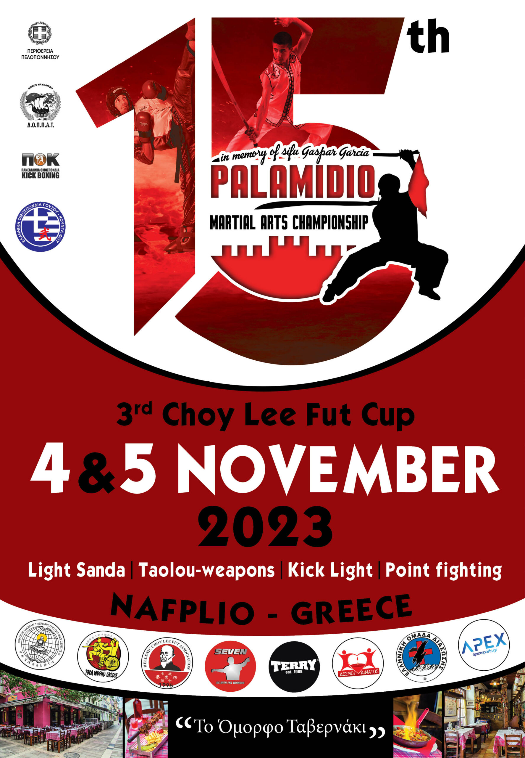 Πάνω από 500 αθλητές και αθλήτριες έρχονται στο Ναύπλιο από όλα τα μέρη της χώρας αλλά και από το εξωτερικό για να συμμετέχουν σε ένα ανταγωνιστικό πρωτάθλημα, που διέπετε από αυστηρούς κανόνες ηθικής και η κάθε διάκριση έχει περίοπτη θέση στην καρδιά κάθε αθλήτριας και κάθε αθλητή. Για ένα διήμερο το Ναύπλιο και η ευρύτερη περιοχή γίνεται το επίκεντρο των μαχητικών αθλημάτων.