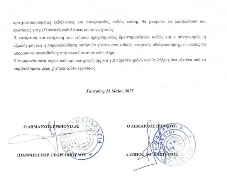 «Με ιδιαίτερη συγκίνηση και αίσθημα ευθύνης, υπεγράφη χθες, Κυριακή 25 Μαΐου 2025, το πρακτικό Αδελφοποίησης μεταξύ του Δήμου Ερμιονίδας και του Δήμου Πηνειού στη Γαστούνη Ηλείας.