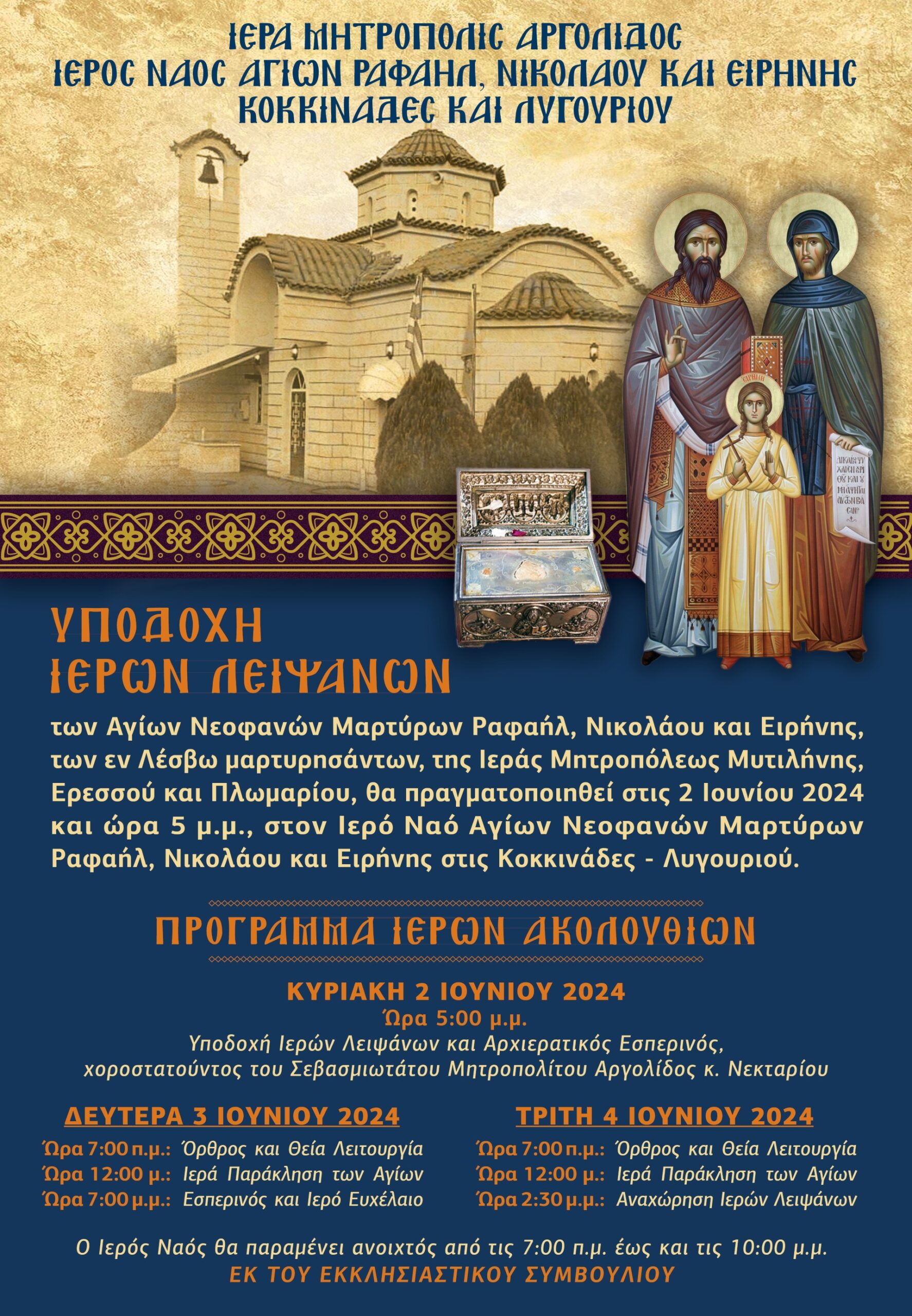 Υποδοχή Ιερών Λειψάνων των Αγίων Νεοφανών Μαρτύρων Ραφαήλ, Νικολάου και Ειρήνης, των εν Λέσβω μαρτυρησάντων, της Ιεράς Μητροπόλεως Μυτιλήνης, Ερεσσού και Πλωμαρίου, θα πραγματοποιηθεί στις 2 Ιουνίου 2024 και ώρα 17:00 μ.μ.,στον Ιερό Ναό Αγίων Νεοφανών Μαρτύρων Ραφαήλ, Νικολάου και Ειρήνης Κοκκινάδες – Λυγουριού