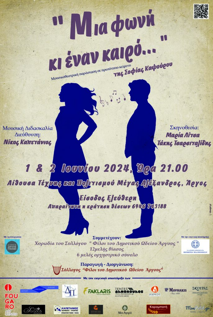 Ο Σύλλογος «Φίλοι του Δημοτικού Ωδείου Άργους» και η Μικτή Χορωδία Ενηλίκων του Συλλόγου παρουσιάζουν τη μουσικοθεατρική παράσταση σε πρωτότυπο κείμενο της Σοφίας Καψούρου «Μια φωνή κι έναν καιρό…»