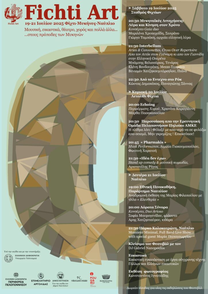 Το FichtiArt επιστρέφει για πέμπτη συνεχή χρονιά, από 19 έως 21 Ιουλίου 2025, με ένα πολυσυλλεκτικό πρόγραμμα που απλώνεται σε δύο ξεχωριστούς τόπους: το Φίχτι και το Ναύπλιο. Μουσική, χορός, θέατρο, performance, εικαστικές και φωτογραφικές εκθέσεις συνθέτουν ένα τριήμερο πολιτιστικής συνύπαρξης και δημιουργίας.