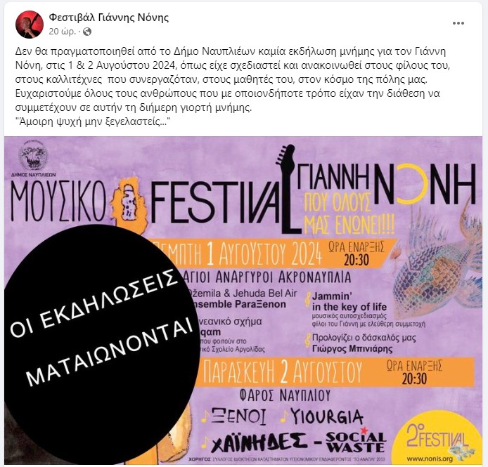 Με μια ανάρτησή τους στο προφίλ “Φεστιβάλ Γιάννης Νόνης”, οι φίλοι του πρόωρα χαμένου μουσικού ανακοινώνουν την ματαίωση των εκδηλώσεων, μετά από την απόφαση της Δημοτικής Επιτροπής του Δήμου Ναυπλιέων.