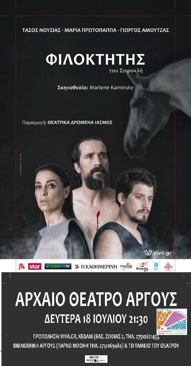 Η τραγωδία του Σοφοκλή «ΦΙΛΟΚΤΗΤΗΣ» θα παρουσιαστεί στο Αρχαίο Θέατρο Άργους την Δευτέρα 18 Ιουλίου στο πλαίσιο του Φεστιβάλ Άργους Μυκηνών 2022 που διοργανώνει η ΚΕΔΑΜ. Ώρα έναρξης: 9.30 μμ