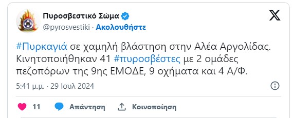 Φωτιά σε χαμηλή βλάστηση ξέσπασε το απόγευμα της Δευτέρας (29/7) στην Αλέα Αργολίδας  Κινητοποιήθηκαν 41 πυροσβέστες με 9 οχήματα και 2 ομάδες πεζοπόρων της 9ης ΕΜΟΔΕ. Από αέρος επιχειρούν 4 αεροσκάφη .Σύμφωνα με πληροφορίες δεν απειλούνται κατοικίες.
