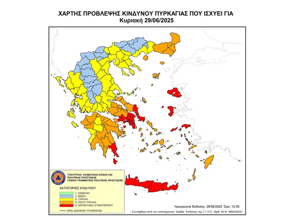 Χάρτης πρόβλεψης κινδύνου πυρκαγιάς: Ακραίος κίνδυνος στη Λακωνία, στο «4» οι υπόλοιποι νομοί για την Κυριακή 29 Ιουνίου