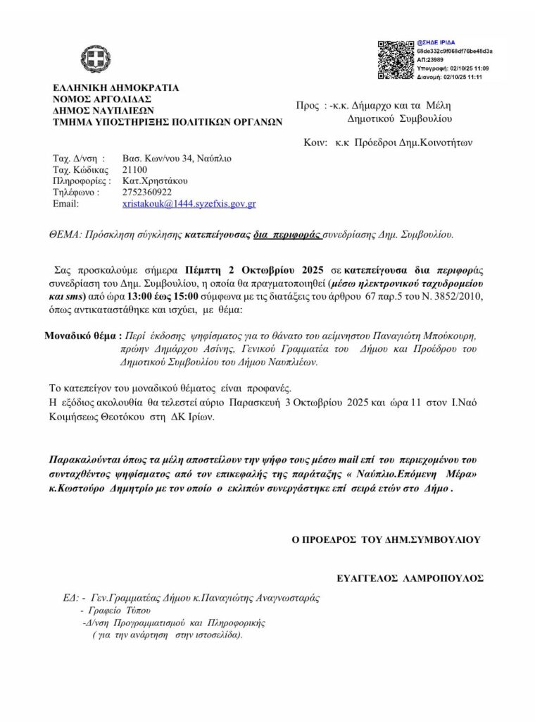 Το Δημοτικό Συμβούλιο του Δήμου Nαυπλιέων , σήμερα Πέμπτη 2 Οκτωβρίου 2025, κατά την 31η κατεπείγουσα συνεδρίασή του , μετά το άκουσμα του θανάτου του αείμνηστου Παναγιώτη Μπούκουρη, πρώην Δημάρχου Ασίνης, Γενικού Γραμματέα και Προέδρου του Δημοτικού Συμβουλίου του Δήμου Ναυπλιέων επί σειρά ετών , σε ένδειξη πένθους και ελάχιστου φόρου τιμής αποφάσισε ομόφωνα την έκδοση του ακόλουθου ψηφίσματος :