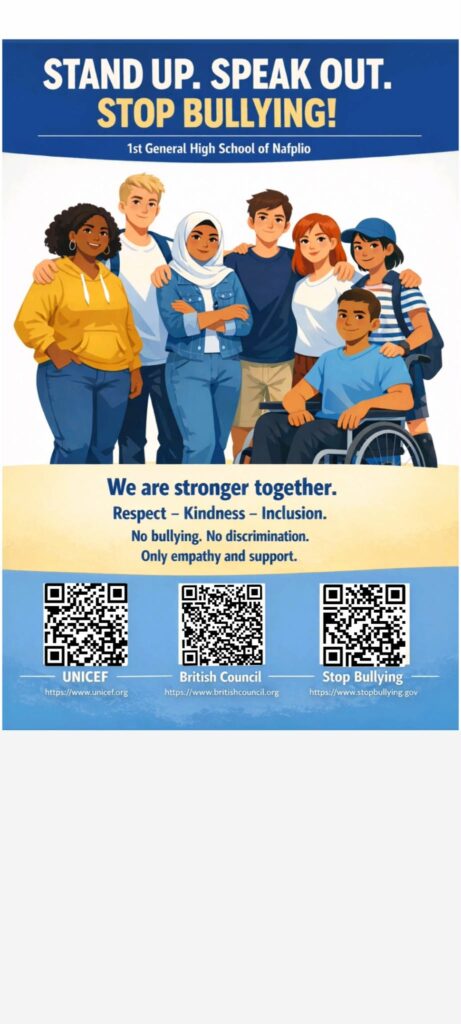 Με αφορμή την Πανελλήνια Σχολική Ημέρα κατά της Βίας και του Σχολικού Εκφοβισμού (6 Μαρτίου), οι μαθητές και οι μαθήτριες της Α΄ Λυκείου του 1ου ΓΕΛ Ναυπλίου συμμετείχαν σε μια σειρά από δημιουργικές και βιωματικές δράσεις με στόχο την ενημέρωση, την ευαισθητοποίηση και την καλλιέργεια ενός θετικού και ασφαλούς σχολικού περιβάλλοντος για όλους.