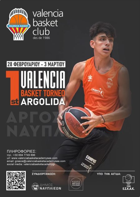 Το 1ο Διεθνές Τουρνουά Μπάσκετ Αργολίδας (1st Valencia Basket Torneo Argolida) με την παρουσία της U16 ομάδας της Βαλένθια και 24 ομάδων αγοριών και κοριτσιών από όλη την Ελλάδα θα πραγματοποιηθεί στο Δήμο Ναυπλίου & στο Δήμο Άργους – Μυκηνών από τις 28 Φεβρουαρίου έως και τις 3 Μαρτίου 2025.