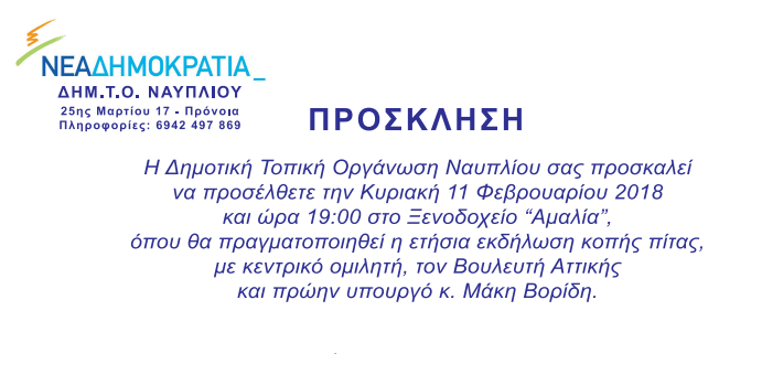 Αυτή την Κυριακή 11 Φεβρουαρίου στις 19:00 στο ξενοδοχείο «Αμαλία» θα πραγματοποιηθεί η ετήσια εκδήλωση κοπής πίτας της Δημοτικής Τοπικής Οργάνωσης Ναυπλίου της Νέας